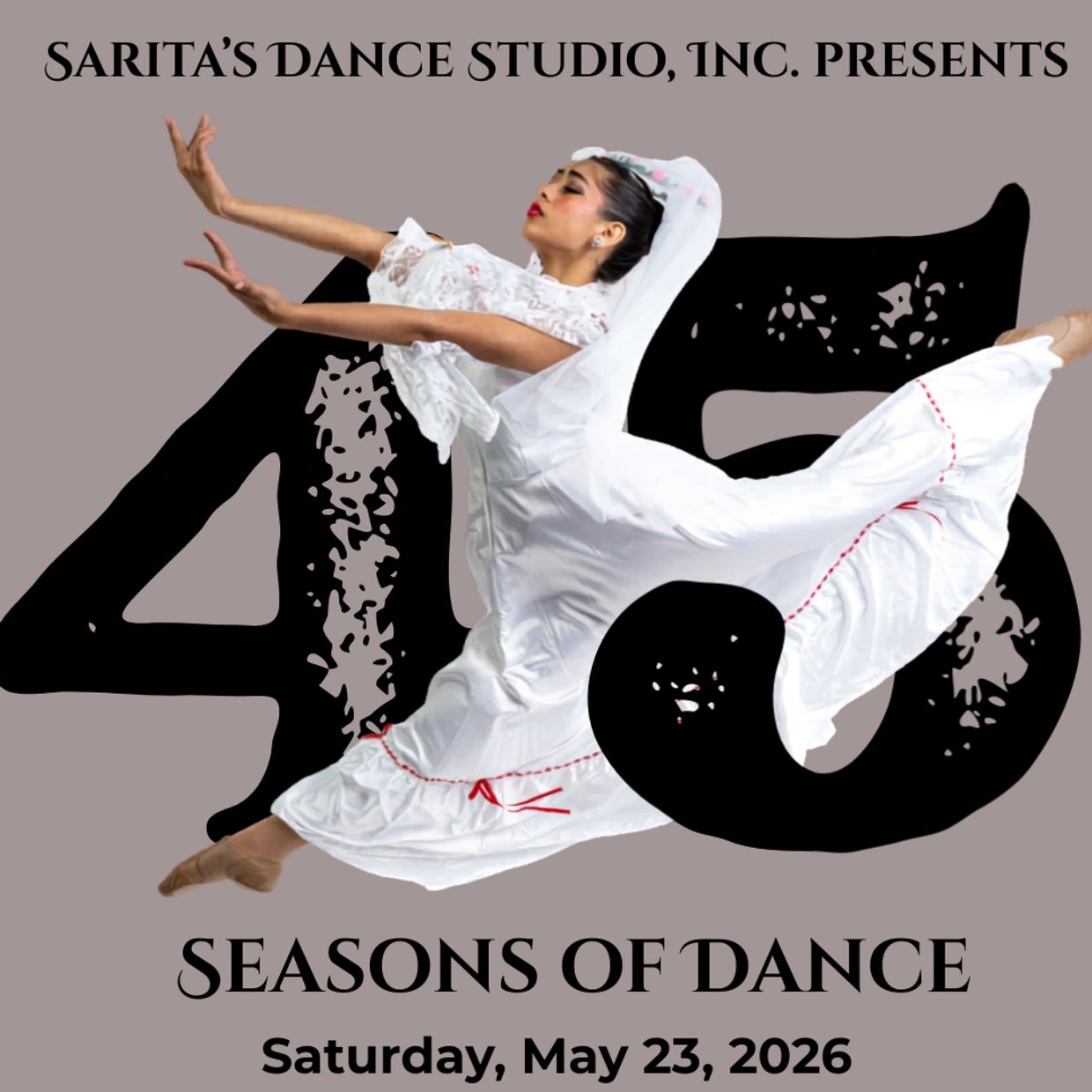 This special dance production will honor the many seasons shared at Sarita's Dance Studio, Inc. by revisiting Sarita's repertory of dance. The show will reflect on the beautiful moments throughout the years, featuring dances that Sarita choreographed or performed in the past as a tribut to her legacy.